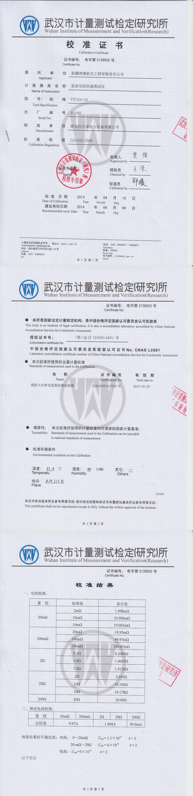 YTC316-10直流電阻測試儀資質(zhì)證書