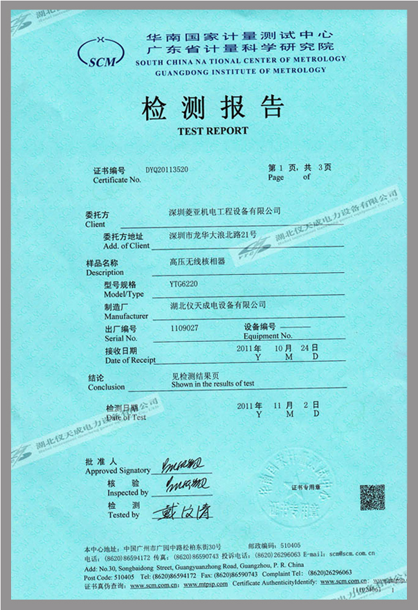 YTC6220高壓無(wú)線核相器鑒定證書(shū)
